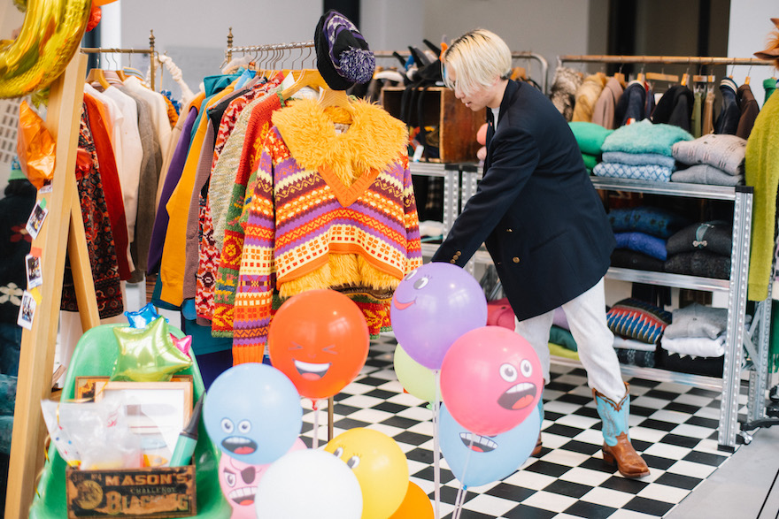 「毎回店内作りにテーマを設けているのですが、今回は“ホームパーティーシーン”がイメージ。80年代のカラーパレットでクラッカーやチェッカーフラッグのシート、ミラーボールなどで装飾しました。」