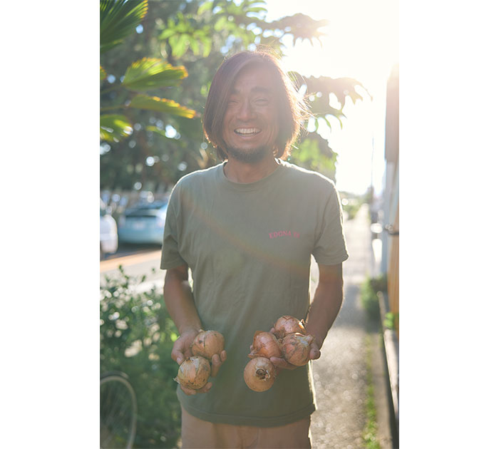 「以前は色々な夏野菜を作っていたんですが、夏野菜ってすぐ成長するんですよね。ここから車で30分くらいかかるところに畑があるので、毎日は行けないし、行けるときに行っていると捨てなきゃいけなくなるほどどっさり採れてしまう。勿体無いので夏野菜はやめて今は玉ねぎだけになりました。これが一番手がかからなくて無理なく育てられるんです。収穫した玉ねぎは家の料理に入れたり、こうやって海の仲間にあげたり…。家庭用だけでなく、イタリアンのお店のピザになったり、カレーの具になったりと色々なところで活用してもらっています」(オーナー横田さん)