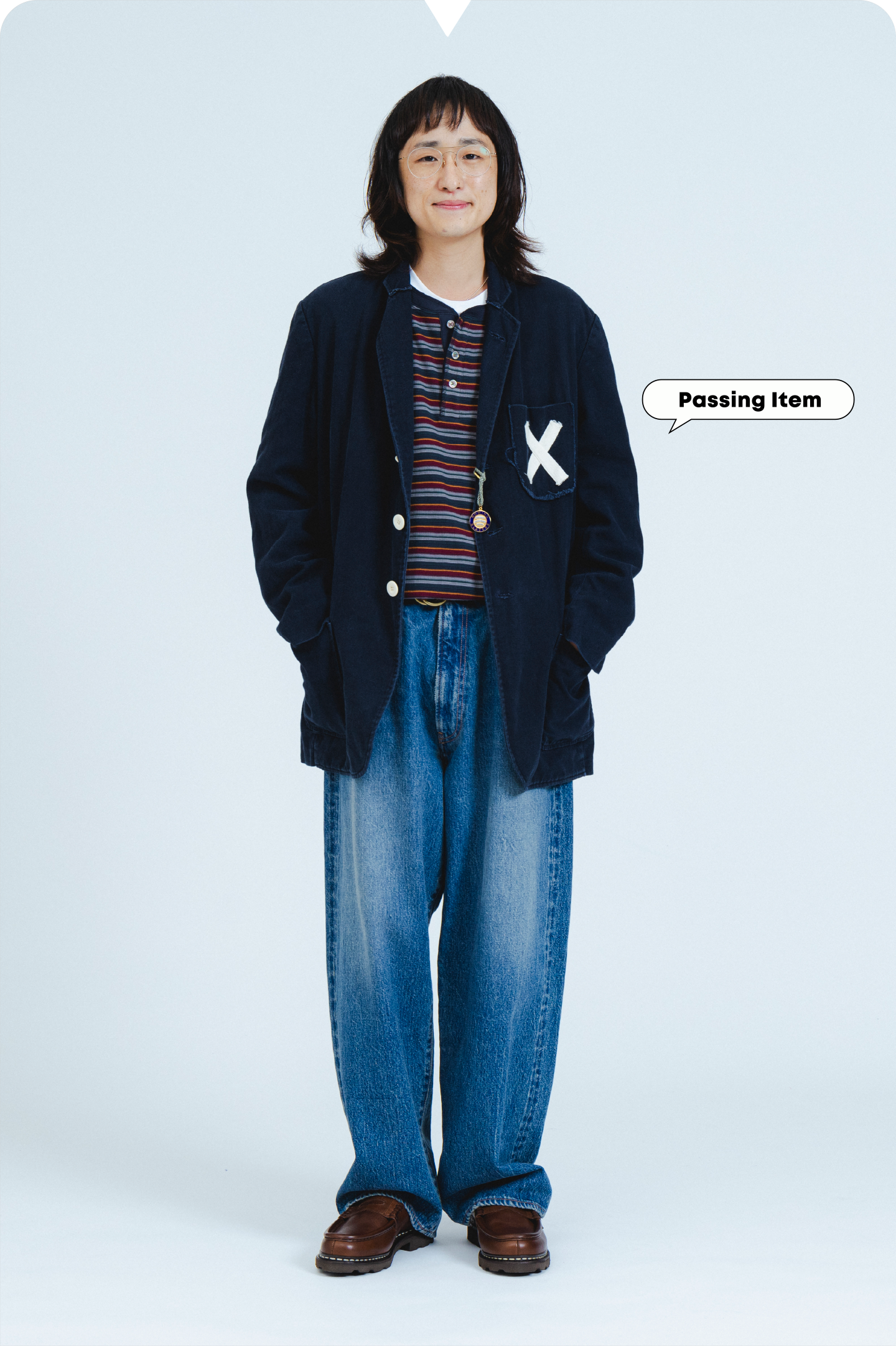 若山さん:沢山着込まれているこのアイテムを実際に受け取ってみて、柳井さんが注いできた愛着をひしひしと感じました。私は普段ジャケットを着用する機会が少ないので、心がけたのは、肩肘張って見えない普段通りのスタイリング。最近個人的に注目しているヘンリーネックTシャツや偏愛しているデニムジーンズを合わせてみました。ブレザーのコットンツイルが持つ味のある粗野な雰囲気が、私のスタイリングを格上げしてくれている気がしています。