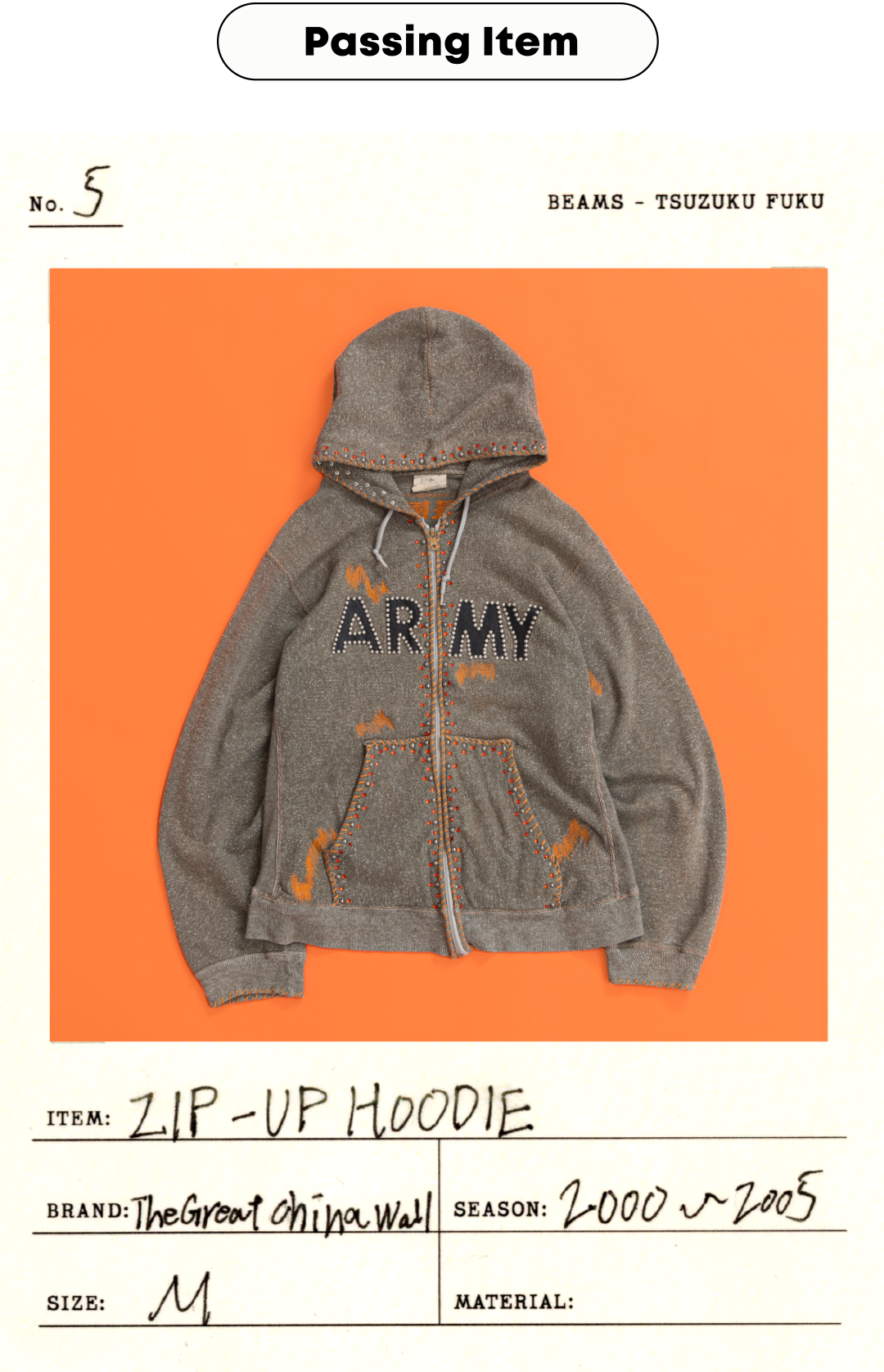 松廣さん(ゆずる人):子どもの頃から好きな「インディペンデントでDIY」の精神。ある時、その素晴らしさについて自分自身が高い解像度で理解できていないことに気づいたのがきっかけで、2000年代初頭にカルト的な人気を誇った 〈The Great China Wall〉のデザイナーAlfredo Settimioにインタビューをしました。この方に会いに行ったのは、持っている服の中でこの精神性を最も感じるブランドのデザイナーに話を聞きたかったから。様々な気づきや再確認ができたとても貴重な時間でしたが、自分に向けて「情熱を持って物事を見つめ、何かを生み続けることで物事をもっと良くしなさい」という言葉をくれたことも心に残りました。この服を着るとその時のことを思い出し、創作を続ける意欲が湧きます。そんなDIY・インディペンデントの精神が宿るつづく服です。