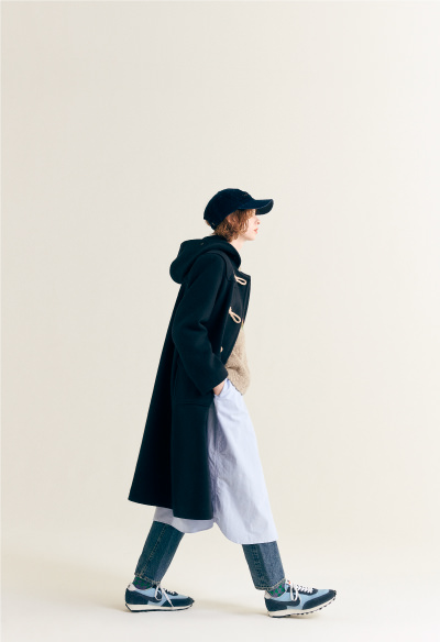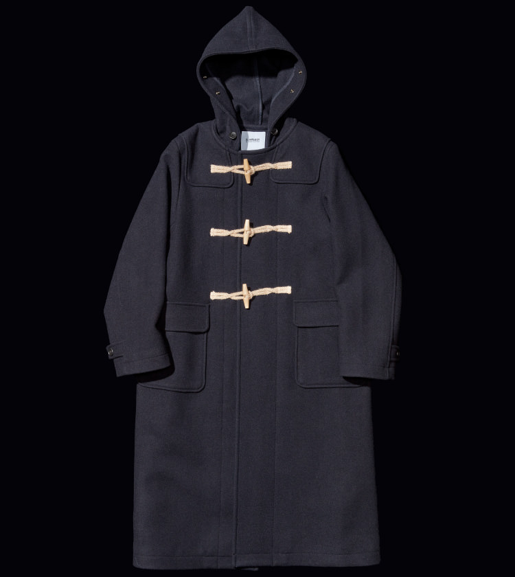 喜歡有厚重感的大衣厚實強韌的Melton。被認為是沈重、使肩膀僵硬,難以著用的素材,但正是因為這樣才可愛也是事實。大衣命名的由來是來自在比利時安特衛普州的迪弗爾鎮(Duffel), 在英語發音則為“Duffle”。這個小鎮的特產是綾織結實的羊毛面料,因為有很強的縮絨量,水不易暈染,具有良好防風防水的功能。自誕生後幾乎不變的設計,是長版大衣的完整體。1940年代紐約哥倫比亞大學周邊集結的Allen Ginsberg、Jack Kerouac、William S. Burroughs等「Beatnik」們所真實著用的常春藤風格大衣。