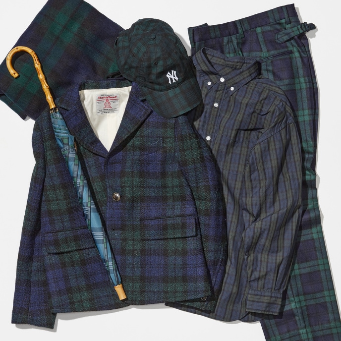 Black Watch單品所融合的搭配,特色為可將不同布料感的格紋設計創造出統一性。如素色般Black Watch的特性就是非常好的例子