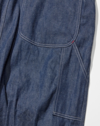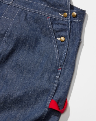 解析1950年代到1960年代牛仔工作服的丹寧面料,本次使用〈orslow〉別注特別製作的面料。選用女生日常也能輕鬆著用的9盎司丹寧。細節的紅色非常有亮點,下擺的車縫線也是紅色。平常不太喜歡反摺褲腳的我們,這一款單摺也是非常OK的。
