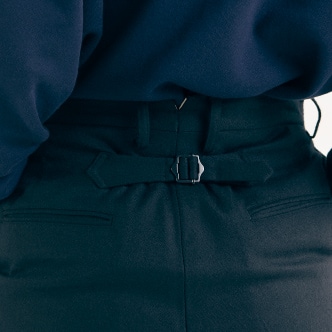 腰圍處則附有可以調整大小的鈕扣,這是本來版型沒有的細節。這是為了不希望露出內裏的我們也能舒適著用而下的功夫。