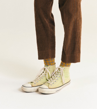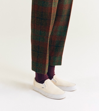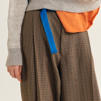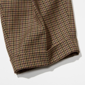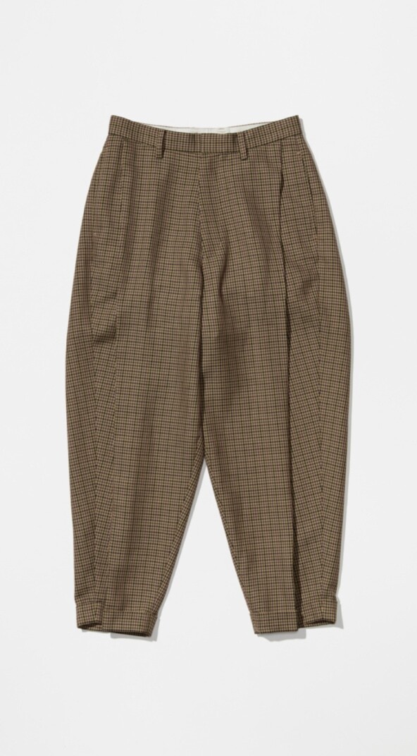 從腰圍到下擺完整的摺邊。與千鳥格紋的花紋相呼應,完美演繹大叔感長褲。