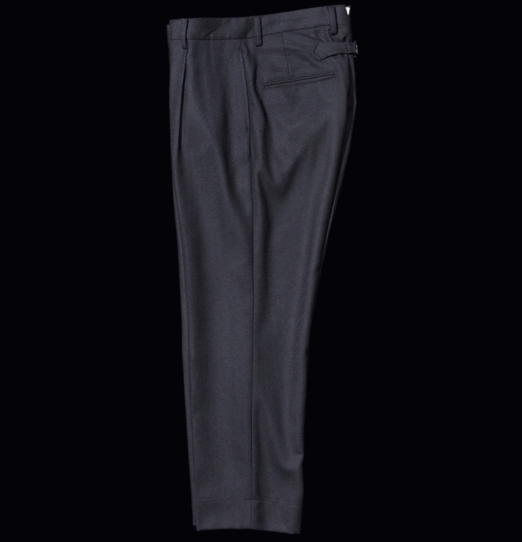 硬幣小口袋也是男裝之中相當重要的設計。另外,側邊口袋採用了沿著摺皺縱向切斷的斜向口袋,讓腰部周圍相當俐落清爽。