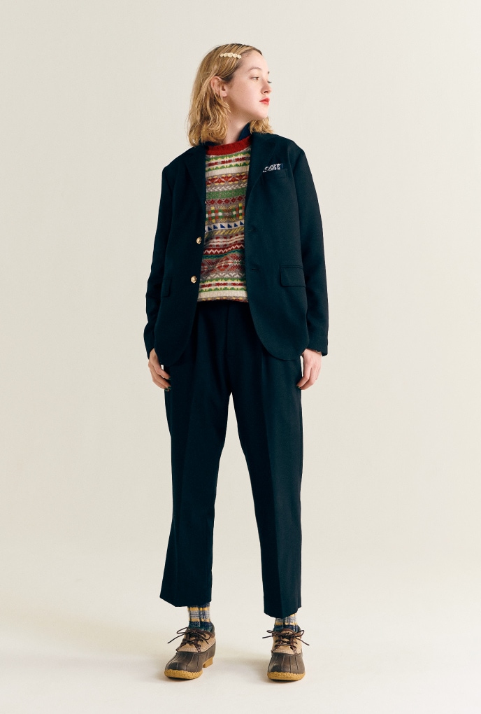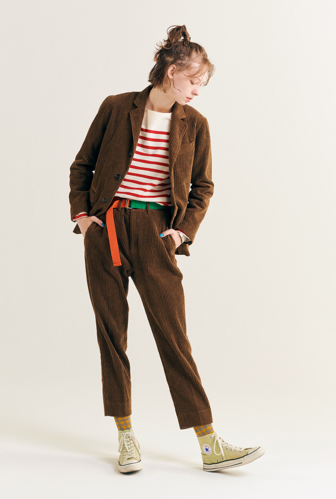 常春藤風西裝外套(Navy Blazer)搭配的西裝褲不是配角走在大街上的紳士,穿著緊身長褲和擦得閃亮的皮鞋的姿態令人迷戀。時而嚴肅地的正式,時而玩味十足的鮮明色調毛衣搭配上牛仔褲。當然要好好的熨平。〈BEAMS BOY〉常春藤長褲的下襬是單一的。不僅僅可以搭配皮鞋,高筒的運動鞋等也很好看。並且作為長春藤長褲的基本便是煙管褲版型氛圍,為了能擴大造型的多變性,改良為俐落休閒的錐形版型。了解源頭,懷著敬意,再加上充滿自身風格的呈現。我認為這也是〈BEAMS BOY〉製作作品的重要之處。