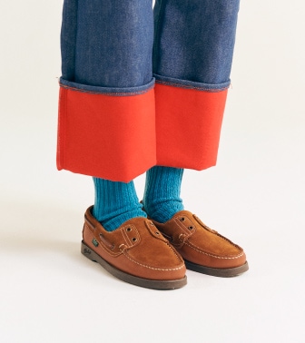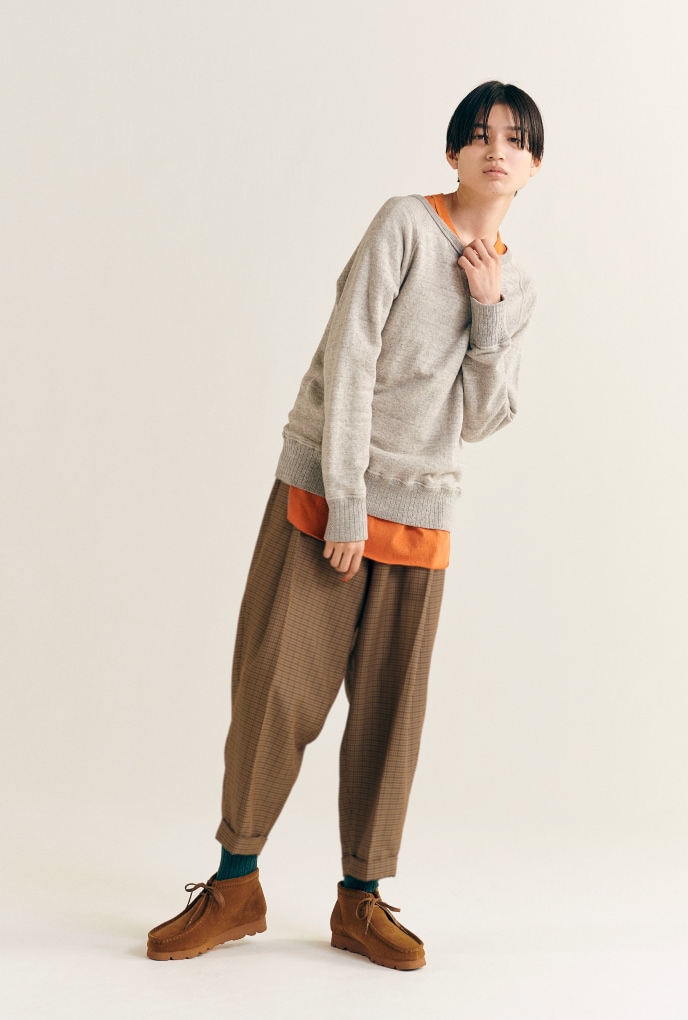 美式英文中具有“寬鬆”意味的長褲「Slacks」(有各種說法)。和常春藤長褲不同,也很喜歡粗野感長褲的我們,把灰色衛衣和〈CLARKS〉的「Wallabee」搭配在一起,穿出理想的大叔感風格。
