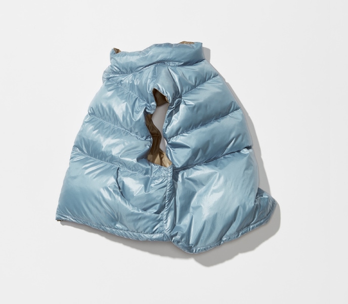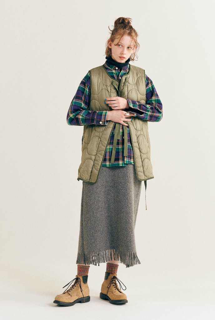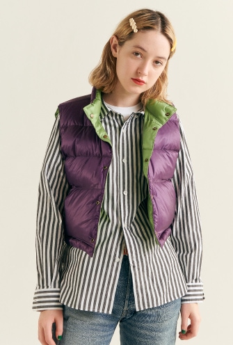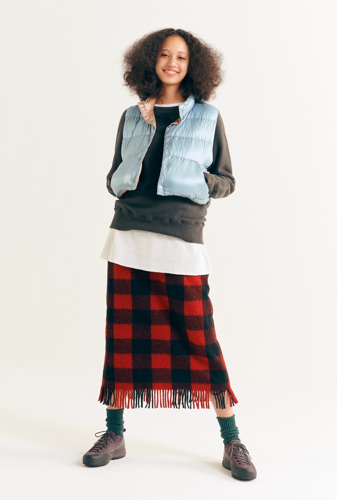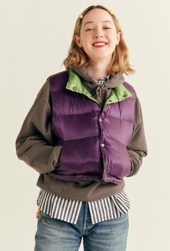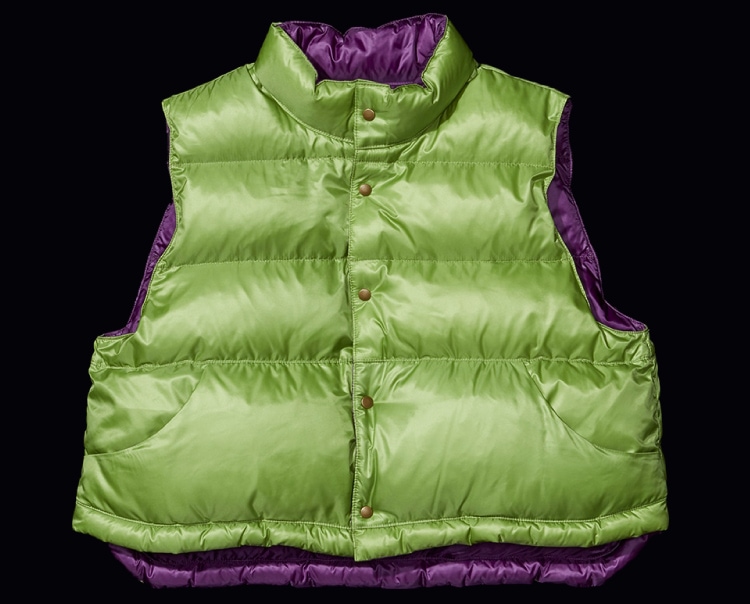 最初是1970年代的經典古著羽絨背心。特別講究的尺寸感的我們,將最喜歡的羽絨背心設計成不分季節皆可著用的合身剪裁。製成秋天可作為外衣、寒冷時期也可當作內搭羽絨背心等活躍單品。 冬天無論如何都會腫腫的我們,就保有多層次造型的意識,盡情享受厚重感吧!