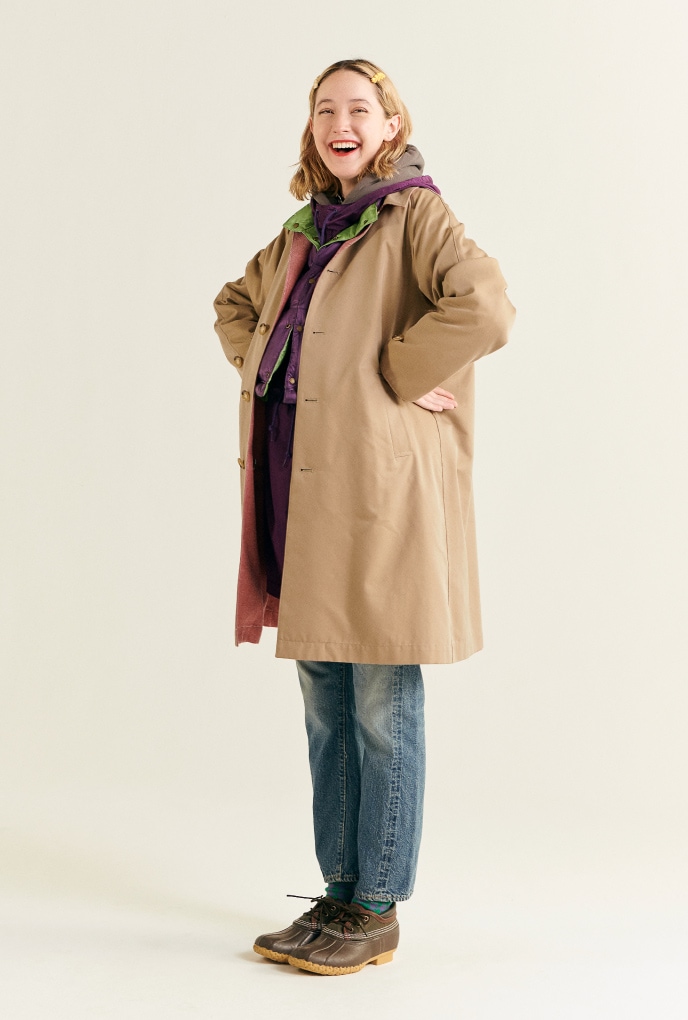 我們最喜歡的是有厚重感的大衣,不過〈BEAMS BOY〉的牛角釦大衣考慮到實用性,我們選用了日常輕鬆著用但也不會過於輕巧的Melton。為了讓女生著用時看起來達到更好的比例,將正面的牛角釦設定在較高的位置。大連帽附有壓釦,調整合身感的同時也可以提高防寒性。