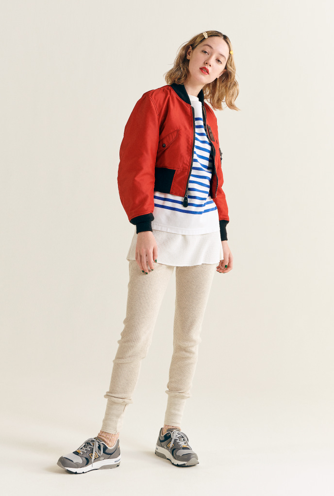 藍白條紋的巴斯克上衣(Basque shirt)內搭長版華夫格上衣、緊身褲,適合居家時光的休閒風格。外搭上紅色的「L-2B」,稍微出門也給人很有精神的感覺。腳上搭配的〈NEW BALANCE〉別說是一英里,好像哪裡都到得了。