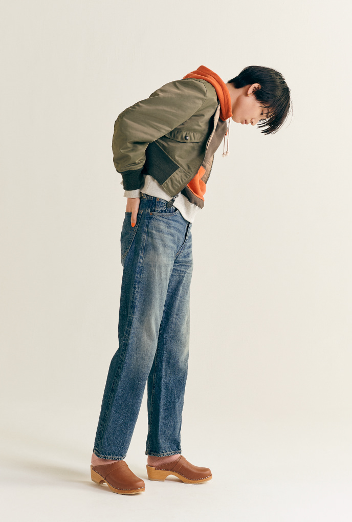 飛行外套×連帽上衣×牛仔褲,美式休閒的王道。鞋子的話,雖想搭配一雙〈Red Wing〉的工作靴,還是選擇了圓頭廚師鞋。享受鞋子部分混搭的風格也很BOY呢。