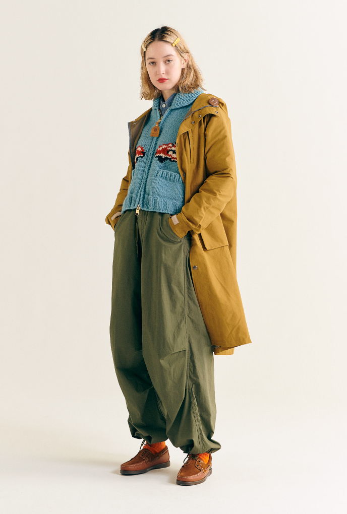 軍褲的話,選擇整體乾淨的穿搭吧!不希望將牛仔褲當作日常的工作服來著用,軍褲則可以做為日常愛用品。搭配上立領大衣,上衣選擇軍褲對比色的毛衣作為重點點綴。