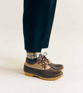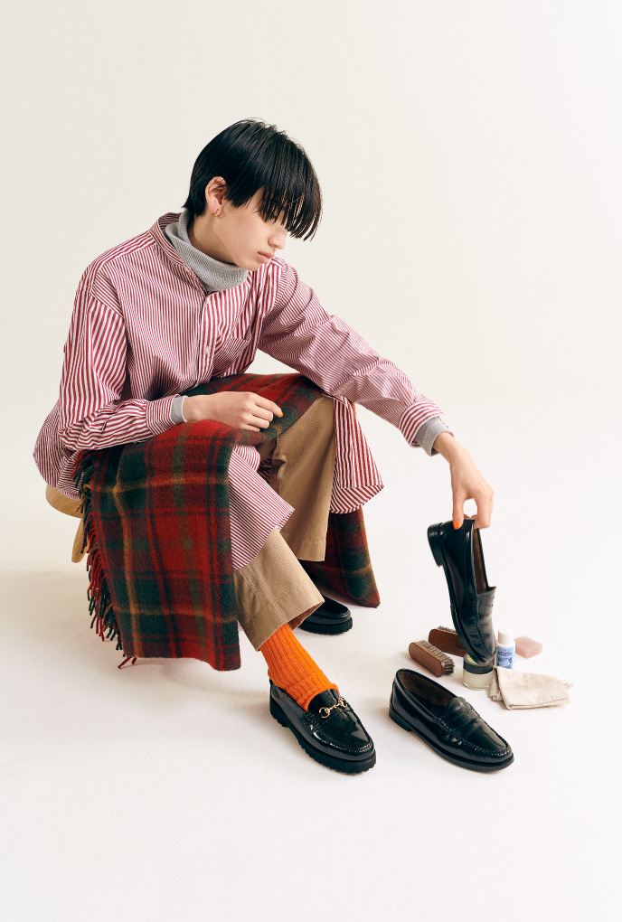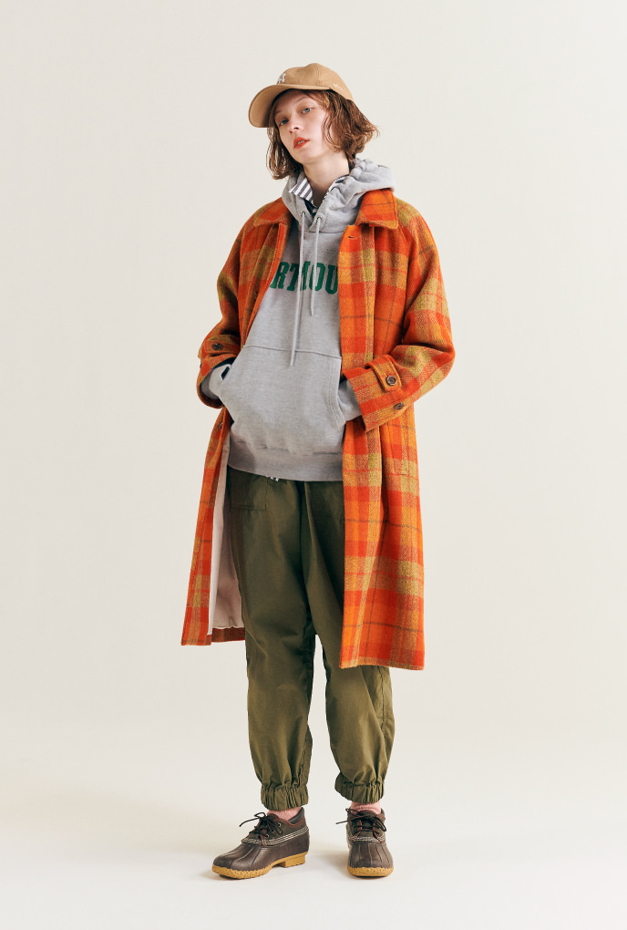 能夠經久耐用的〈HARRIS TWEED〉單品,打扮上也保有HEAVY DUTY的意識。與巴爾瑪肯大衣搭配的有學院風格的連帽衫,軍用褲和獵鴨靴。 濃縮出BOY的定番經典風格。