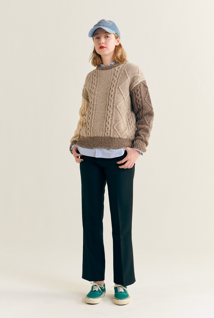 引人注目的阿蘭花紋「漁夫毛衣」,不需要過多的裝飾,選擇簡單的搭配吧!王道的常春藤風格,再加上SHOE CUT壓折線長褲及〈VANS〉的運動鞋,增添了幾分1970年代的氛圍。
