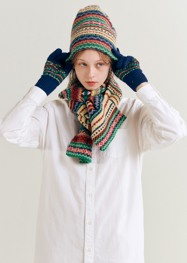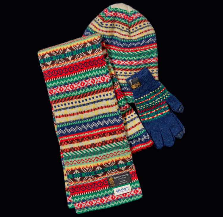 費爾島(Fair Isle)花紋也是〈BEAMS BOY〉冬日不可或缺的主題。從形狀到配色都別注設計的圍巾、毛帽(Watch Cap)及手套,推薦一定要成套購買。