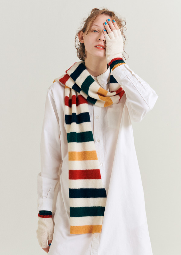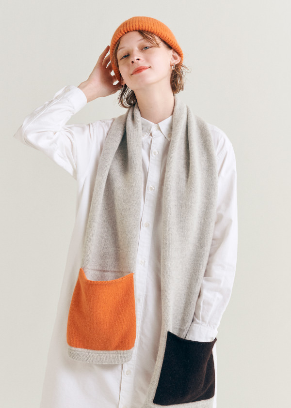 使用安哥拉混羊毛的附口袋圍巾,蓬鬆的質地觸感良好又溫暖。搭配毛帽(Watch Cap)及圍巾的色調,共推出三種顏色。
