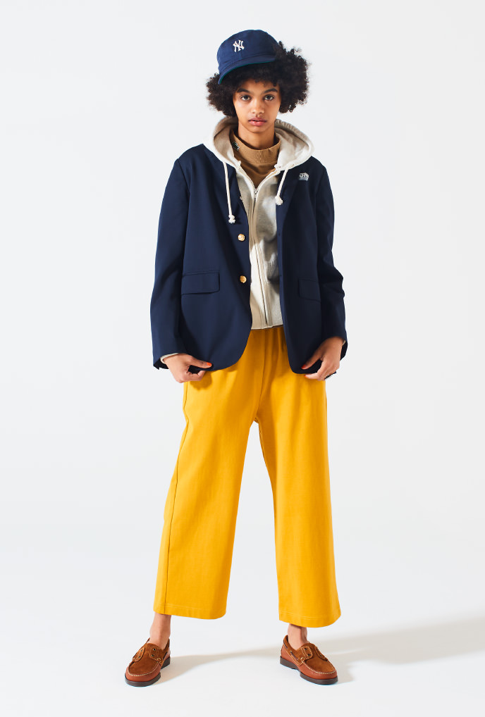 連帽衫(hoodie)與寬褲(easy pants)的組合,只要搭配上西裝外套就完成常春藤風格造型。喜愛東岸風格的我們,也非常喜歡N.Y.棒球帽。選擇與西裝外套同色系的顏色搭配是不是也不錯呢?