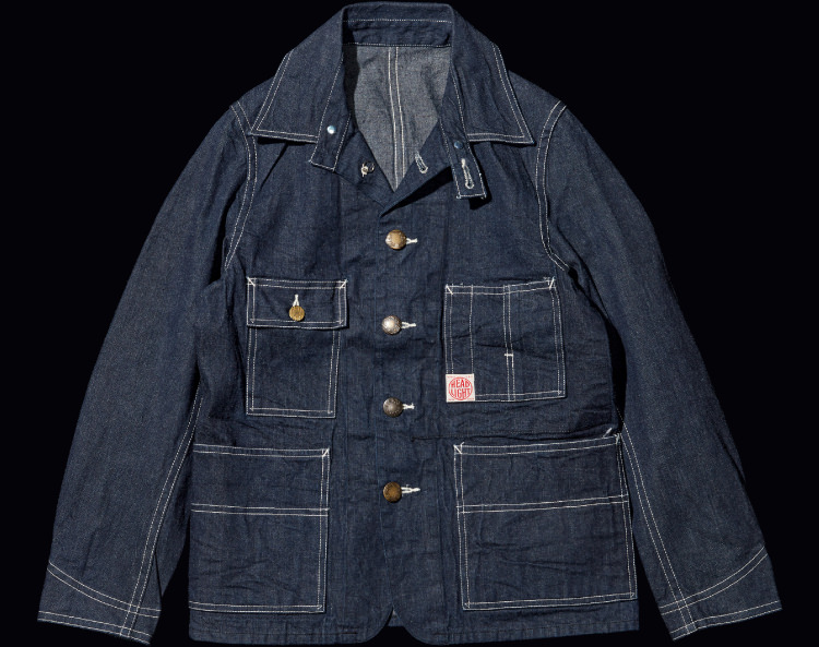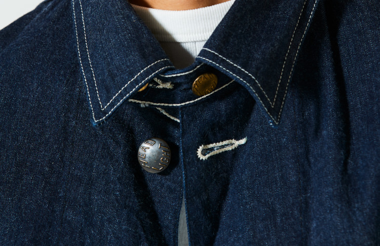 說到美式休閒服就想到丹尼與鴨絨面料的工裝。經過年代洗滌的褪色與斑駁的特徵才是真正有趣的地方。〈HEAD LIGHT〉的工作服是於1942年製造,所謂的“戰爭原型”。再現“戰爭原型”特有簡易的細節,將通常三本的車縫線改為雙線車縫。