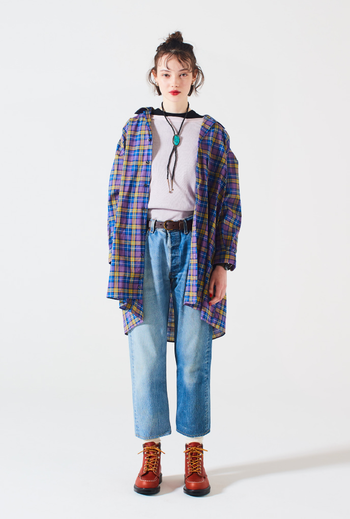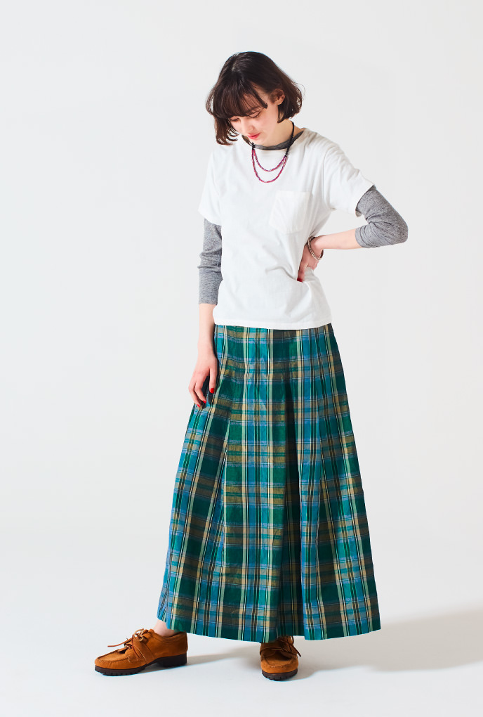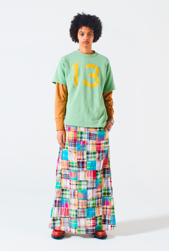 數字T恤裡搭配長袖T恤的多層次穿搭。讓人想要搭配牛仔褲的〈Red Wing〉靴子,此穿搭則是搭配馬德拉斯格紋長裙。嘗試1990年代美式休閒BOY風格的搭配。