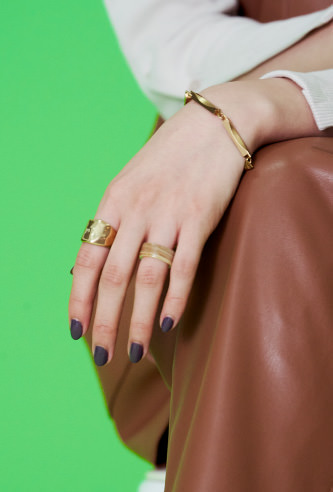 基本色調上添上灰綠色、紫色,並點綴搭配金色調飾品。