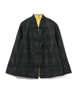ブラックウォッチ、ジグザグのネクタイ、紋章のルームシューズで英国的にまとめたチャイナスタイル。