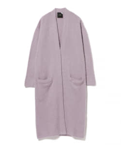 ラベンダーのカシミヤロングカーディガンと光沢感のあるキャメルのワンピースで、色の組み合わせと素材の風合いを楽しんだコーディネートです。
