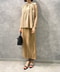 ギャザーネックのブラウスにリネン素材のスカートを合わせたコーディネート。肩の隠れるデザインで、お仕事の場面でも使いやすいアイテムとなっています。スカートはすっきりとしたタイトシルエットとなっています。