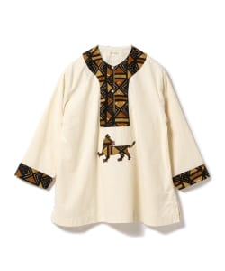 今年9月に開催したアフリカイベントの商材にガーナ国アサフォ旗がありました。各部族がアップリケして自らを誇示する為に使われていた物です。状態の良い物、アップリケに特徴が見られる品は収集家の間でも人気となって居り、専門書も有ります。その旗のイメージとアフリカ伝統衣装ダシキシャツを掛け合わせてfennica アサフォシャツは生まれました。Orslowオリジナルのプリント生地に加え、普段は行っていない刺繍でライオンをあしらっているスペシャルな1着。お取り扱いは白のスレキ生地、ライトオンスデニム生地の2種類です。サイズ感はメンズ、レディース共にかなりのオーバーサイズでスモックのように中にニットを着るゆとりがあります。コーディネートに使用したパンツもOrslowとの合作ですが、長くなってしまいましたので、詳しくは次回に触れたいと思って居ります。