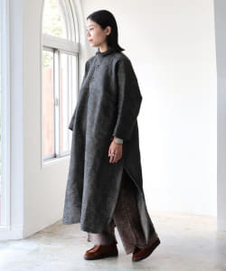 <Quitan(キタン)>のワンピースは生地が厚くしっかりしているのでコートワンピースのような感覚で羽織れます。スリットが深いのも特徴的で、中に着るスカートやパンツとレイヤードを楽しむことができる点もおすすめです。 手に持っているのは沖縄、松田米司工房のお茶碗で、このランダムなジグザグ柄が気に入っています。
