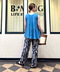 前後2WAYで着用可能なティアードブラウスに総柄パンツを合わせて大人のリラクシーコーデ♪ブラウスのボタン側を前で着る時は、1番上のボタンを1つだけ開けて着るのがおすすめ◎骨格ストレートの私はフレアシルエットのトップスが苦手ですが、落ち感のあるパンツを合わせるとバランスよくなります!
