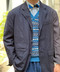 ENGINEERED GARMENTSの別注ミッドフィールドブレザーをメインにスタイリング。フェアアイルのニットベストとデニムトラウザーズでラフなスタイルに仕上げております。