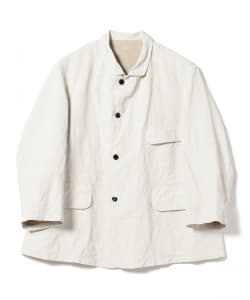 着用している〈outil〉は1930’sフランスの薄いシャツコートをベースにデザインされています。 リネンの自然な色合いがそのまま残る生地に、白い染料でコーティングされた生地が特徴で、お尻が隠れる絶妙な着丈バランスがお気に入りポイントです。