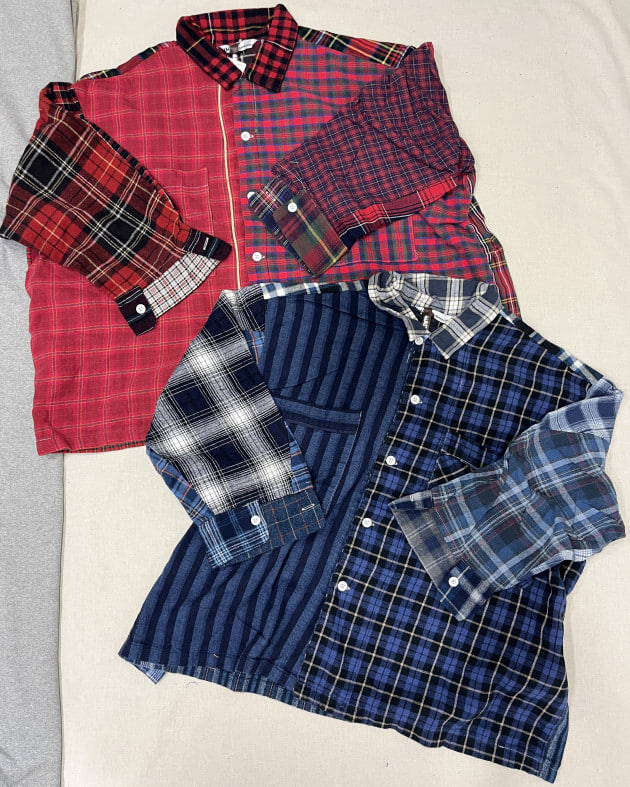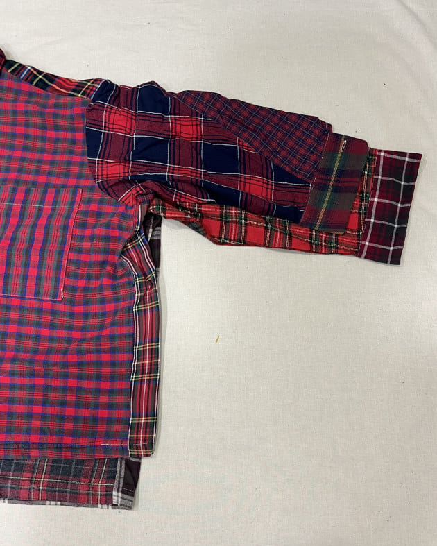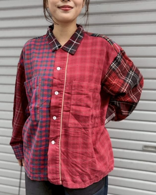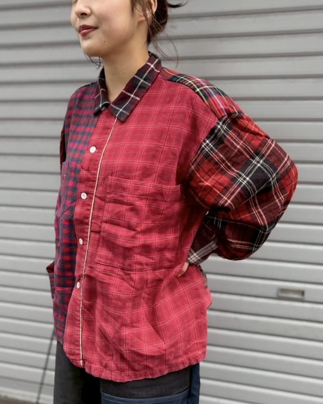 こちらは古着のネル素材のガウンを解体し作成!レッドとブルー、同色系のパッチワークとなっております。