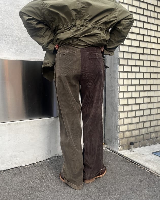 太畝のコーデュロイパンツをリメイクしており、2本のパンツを左右でドッキングさせています。そのため、左右でシルエットやレングス、裾の仕様が変わったりするところも個性派で魅力的!