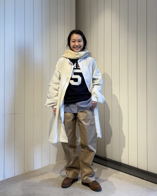 以前よりも少しすっきりとしたサイジングになり、より合わせやすくなりました!上からアウターも羽織りやすいボリューム感です。