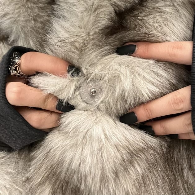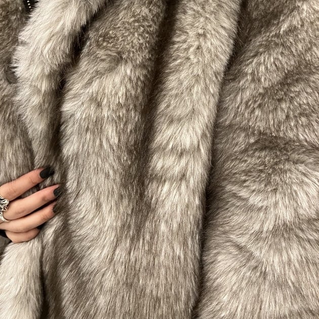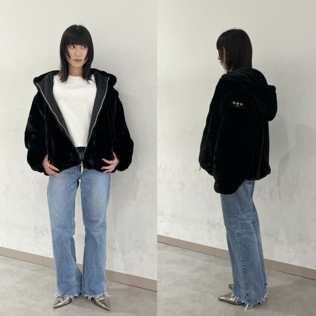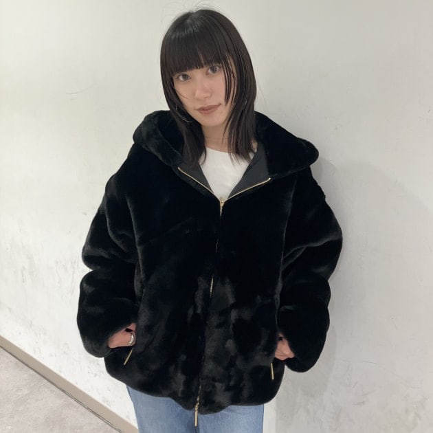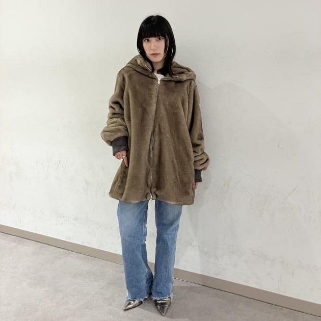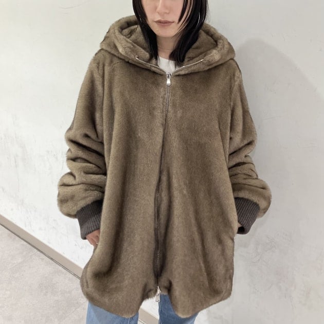 リアルファーのような風合いが魅力のフェイクファーフーディーです。