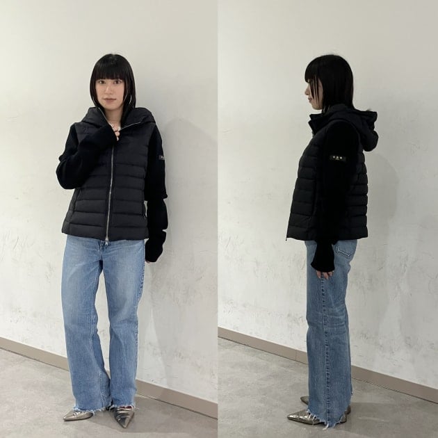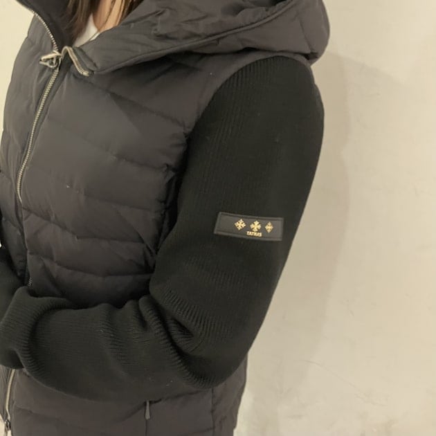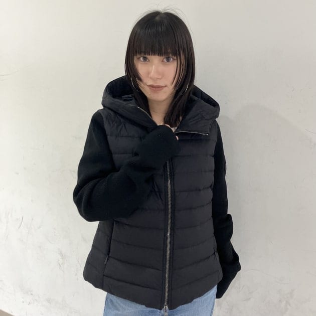 袖をニットで切り替えたフード付きダウンジャケットです。