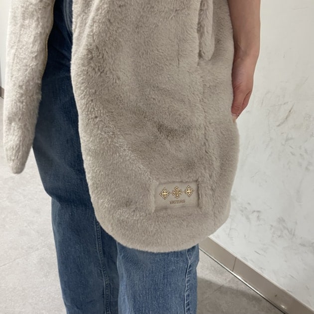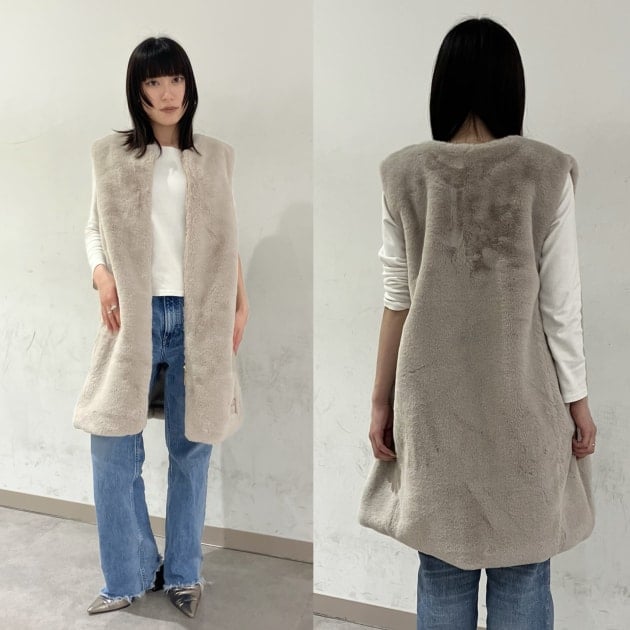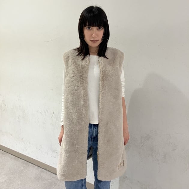艶のある華やかなボア素材を使用したノーカラーロングベスト。
