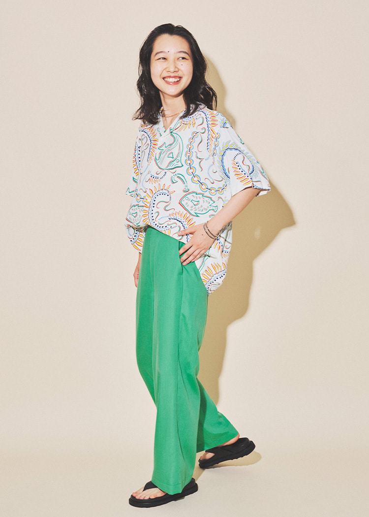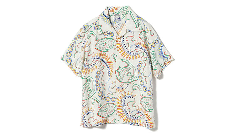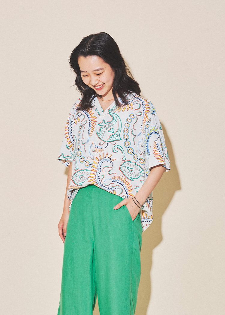 这款夏威夷衫使用了人造纤维面料,触感良好,非常适合搭配具有粘稠感的鲜艳亚麻裤子。充满夏日气息的配色一定会让人心情愉悦!