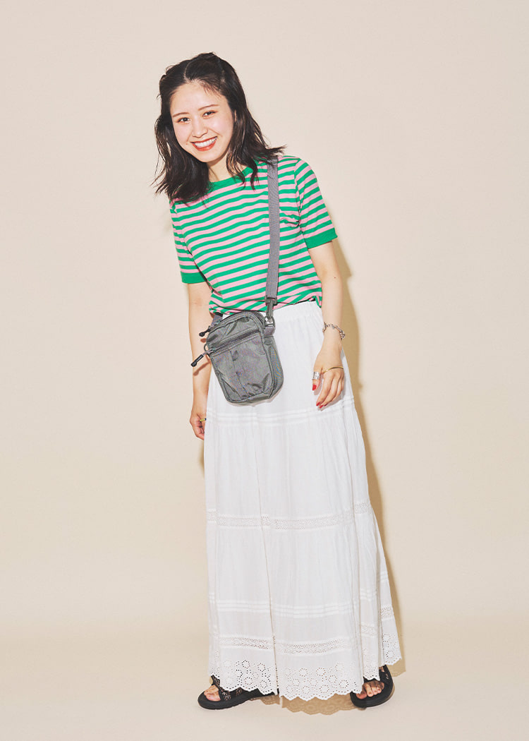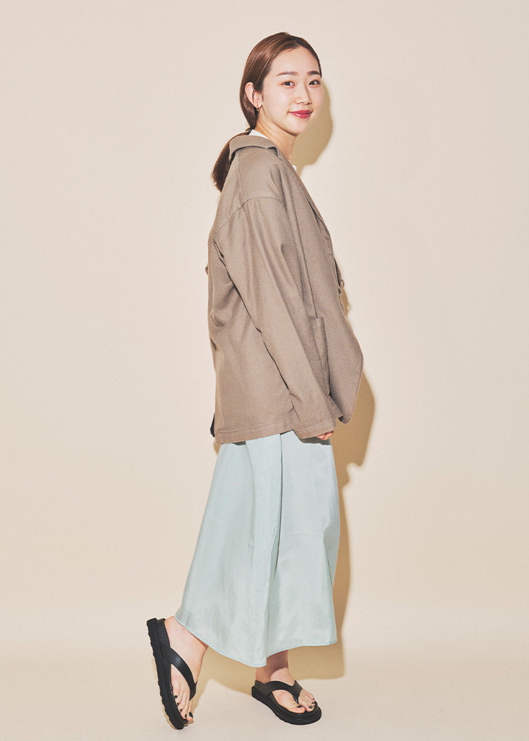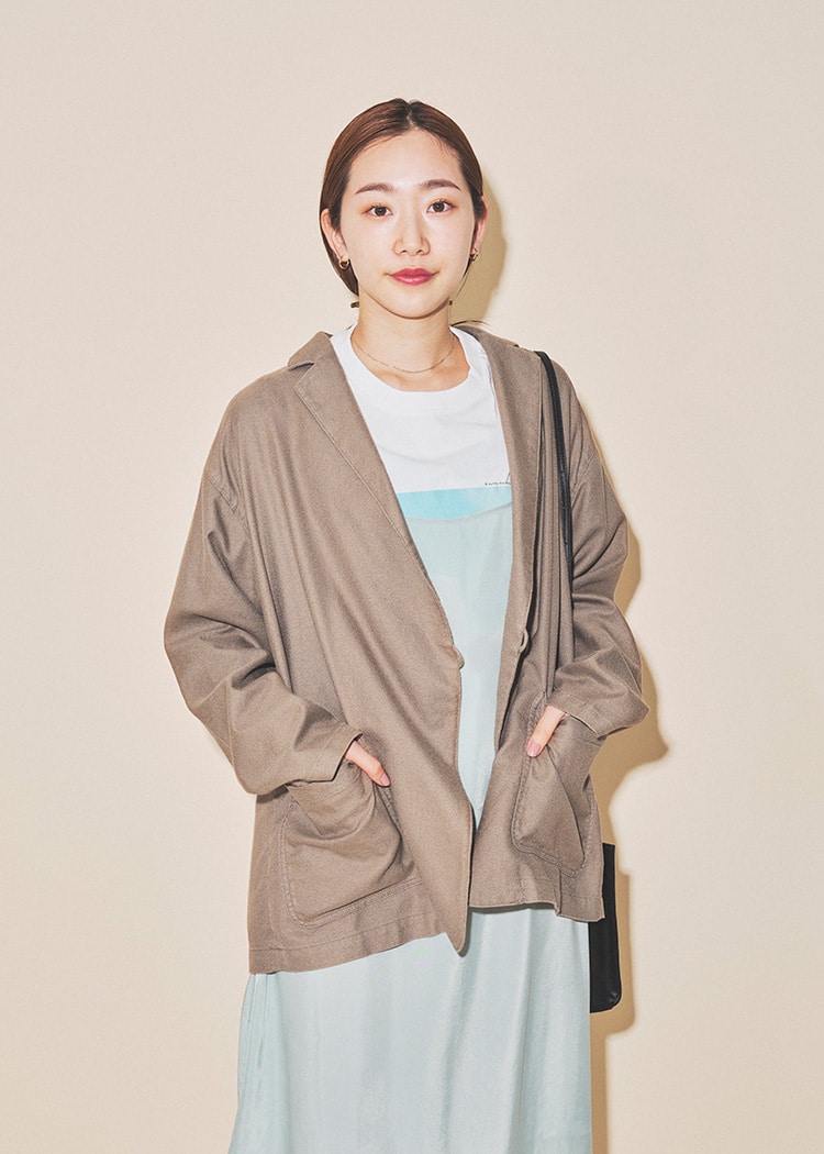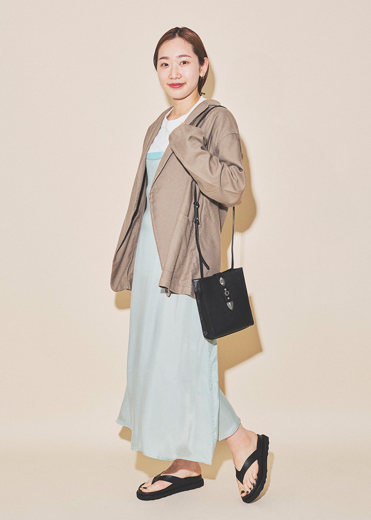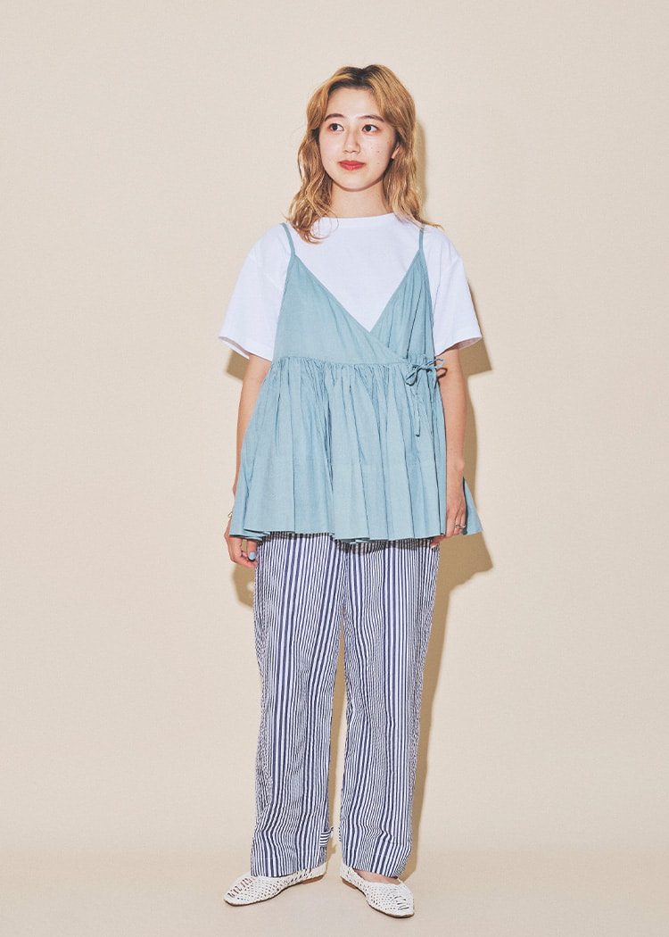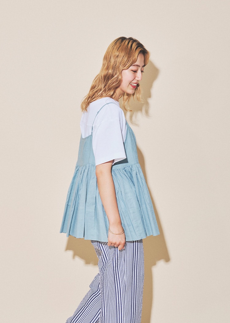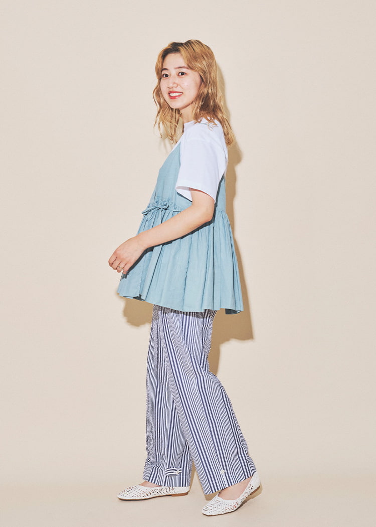 只需在简单的上衣上叠穿,即可轻松享受叠穿风格。为了不显得过于甜美,选择了清爽的下装。