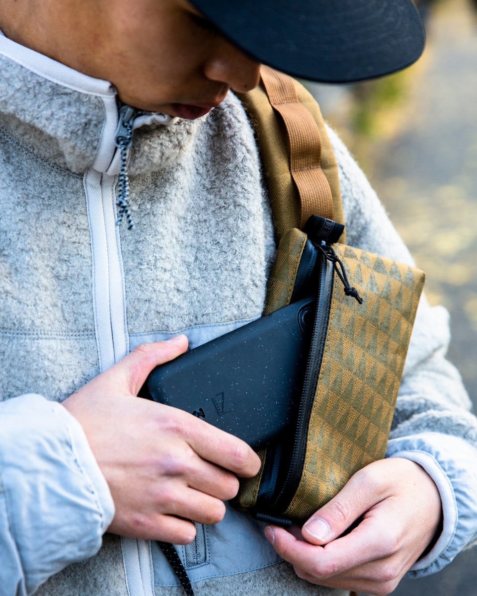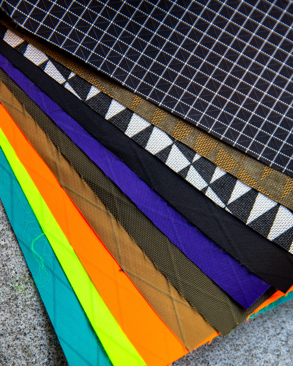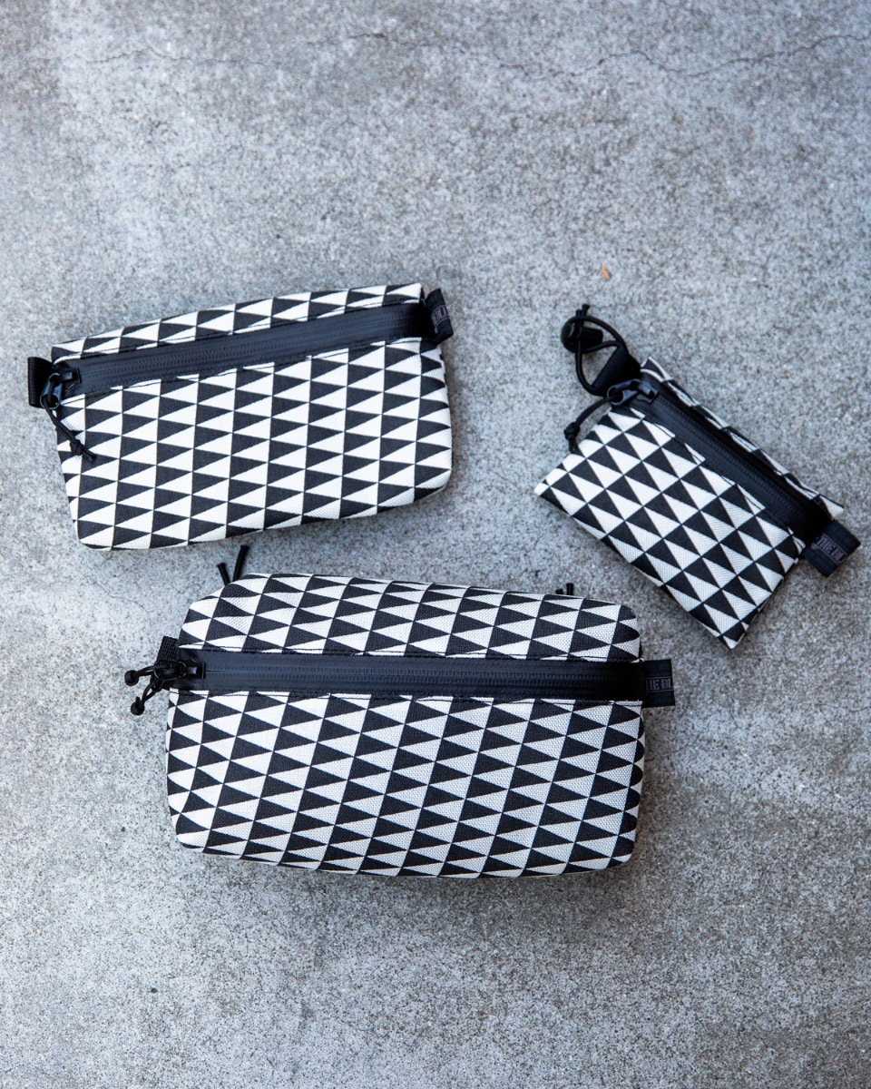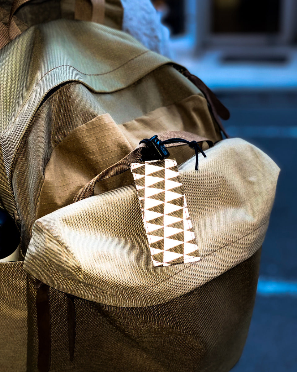 可连接到定制背包肩部的别住小袋可以根据您的规格定制,采用十几种不同的面料,包括来自 < Pilgrim Surf+Supply > 的三角旗图案。