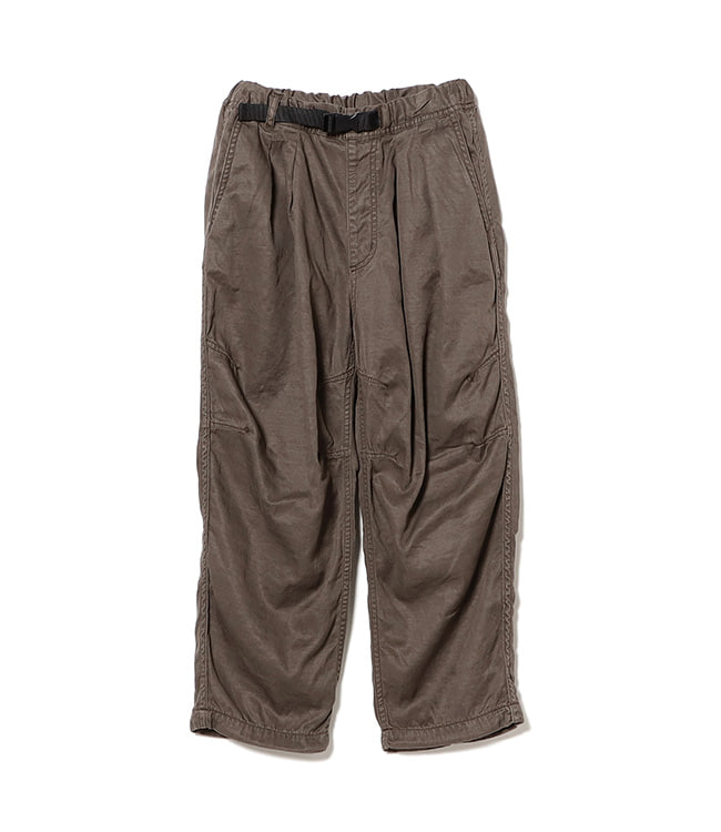 落ち感のあるスラブツイル素材を使用したFADE BALLOON EASY PANTSは、ヴィンテージを思わせる製品加工が特徴です。裾はスピンドル仕様でシルエット調整が可能であり、ウエストはオールゴム仕様で着脱が容易。快適さとスタイリッシュさを両立するリラックスシルエットのパンツです。