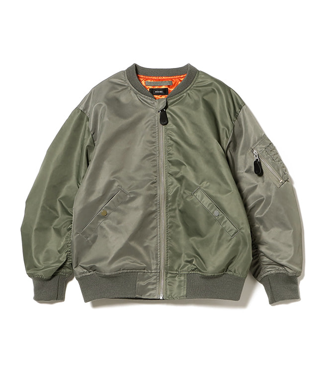 撥水機能のあるヘビーナイロンツイル素材を使用したCRAZY LOOSE MA-1フライトジャケット。メンズと同様の特徴的なカーブを描いた袖や、立体的な表情を生むパッカリングのステッチングを採用し、大人顔負けのクオリティを実現しました。オーバーサイズでも袖口のリブでしっかり留まり、こなれた印象の着こなしが楽しめます。