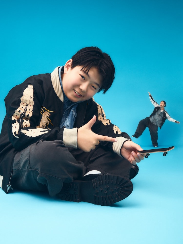 過去に〈BEAMS〉で別注したモデルをベースに、キッズサイズに落とし込んだセットアップ。トップスは両脇ポケット付きのクルーネック型を採用しており、ラグラン仕様で着心地はもちろん伸縮性と通気性に優れたポリエステルジャージー素材の快適性を保持。象徴的なパピヨンの刺繍デザインが、華やかさとストリートのエッジを効かせた特別な一着です。