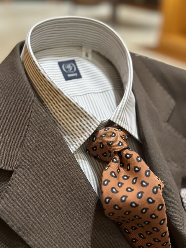 アメリカンとなると、クラブストライプやチェックネクタイなど色々思い浮かびましたが、東海岸側の雰囲気をイメージして、ペイズリーネクタイを!