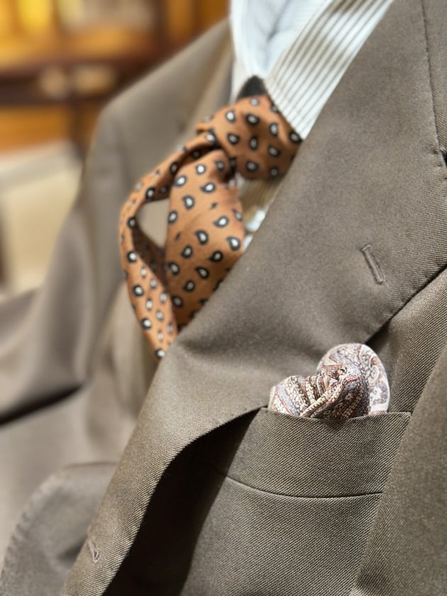 それに映えるマットな表情ののオレンジペイズリーねくたいを!細かなドットペイズリーというところが上品さと気品と遊び心を感じさせるネクタイ。