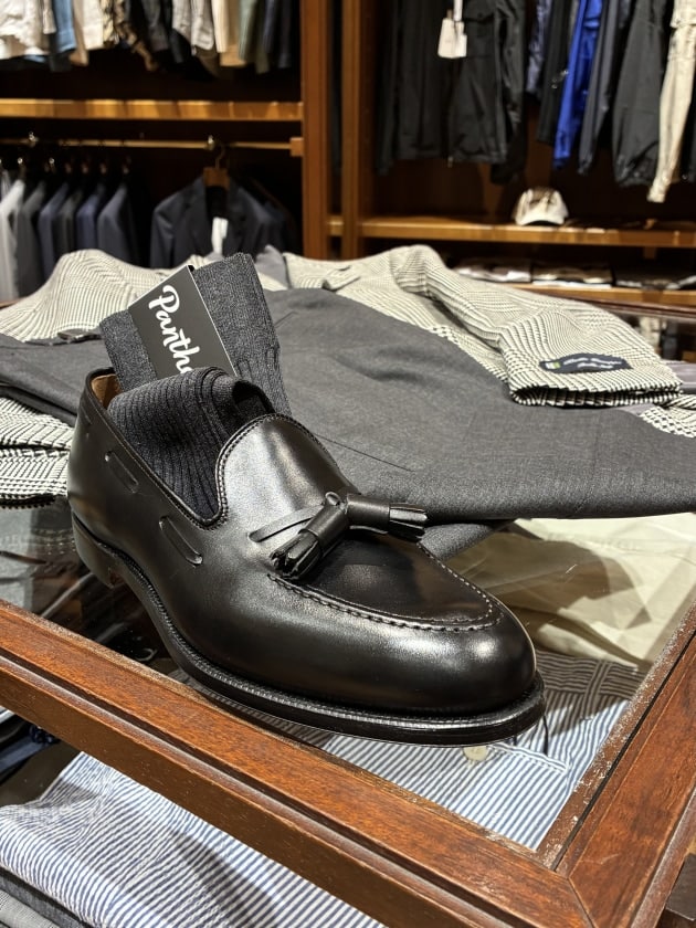 カジュアルさを抑えたドレッシーな表情のローファーとスーツスタイルの相性はよろしいかと思います。