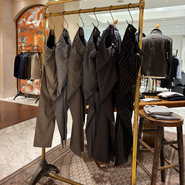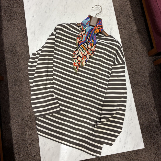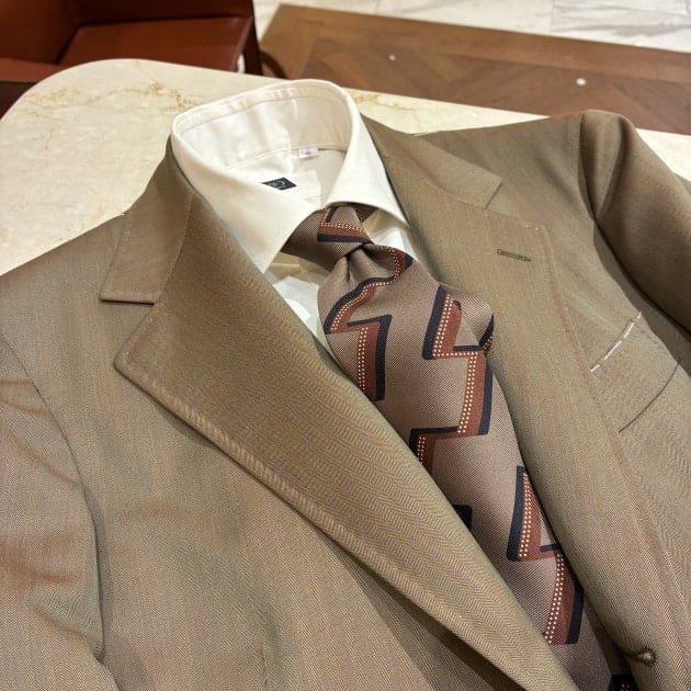 こちらもマイルドで柔らかな印象です。主張の強すぎない絶妙なトーン。ベージュやブラウンに合うことは間違いありませんが、Vゾーン次第ではネイビーやチャコールグレーも楽しめそうです。