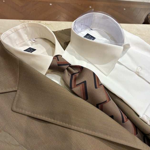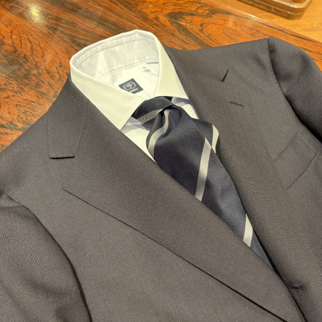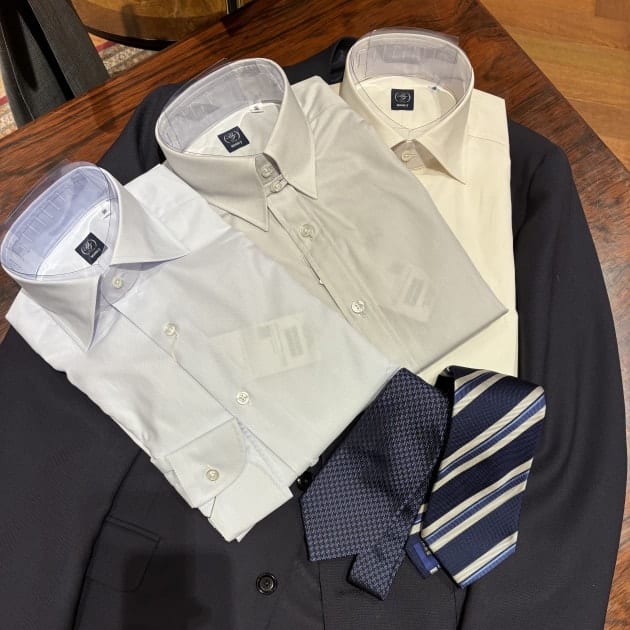まずは"ライトグレー"のタブカラーシャツです。白シャツと比べるとわかるくらい絶妙なトーンです。ネイビーにはもちろん、グレーのジャケットやスーツに合わせて、白よりもモダンな印象になります。